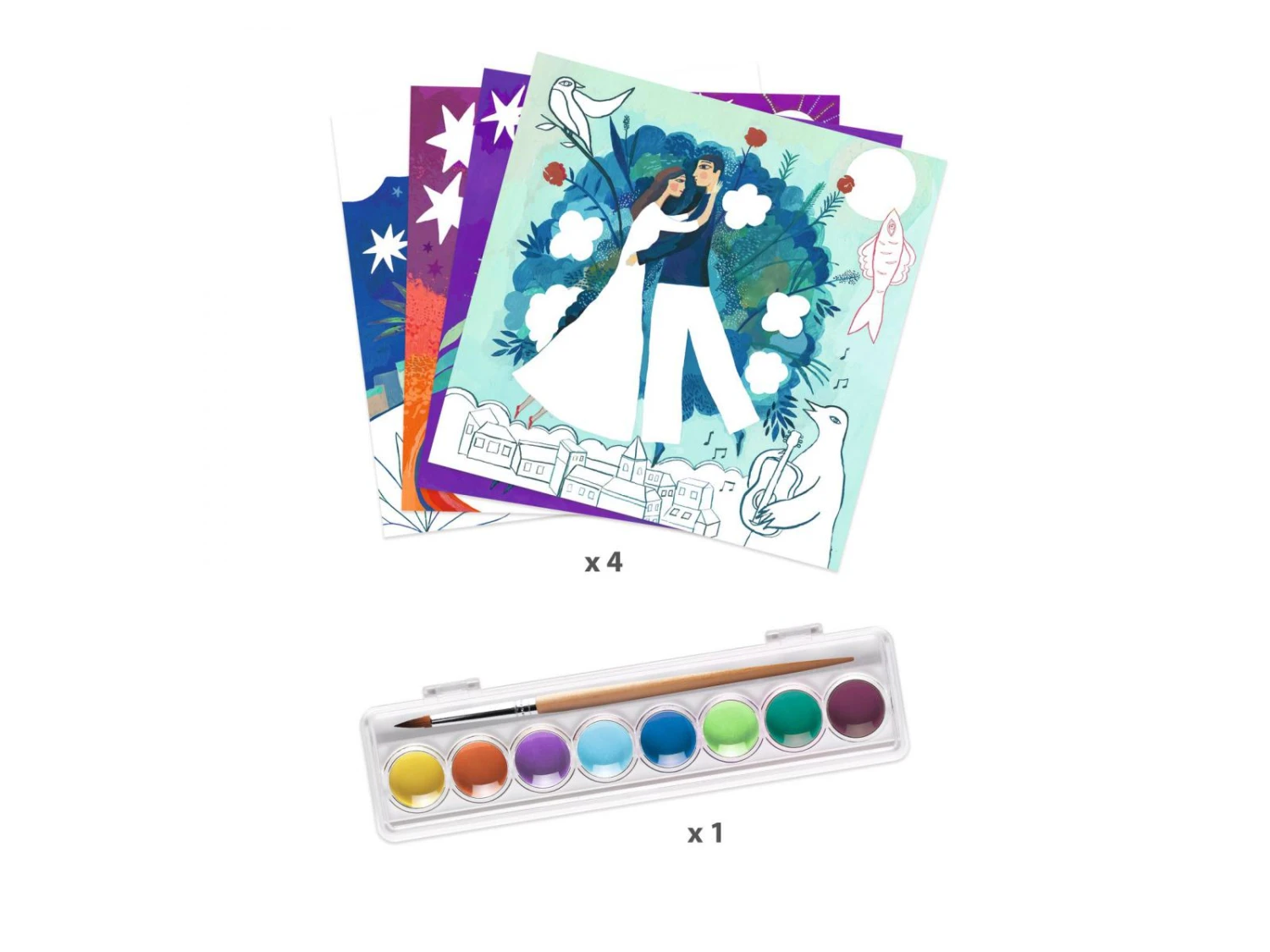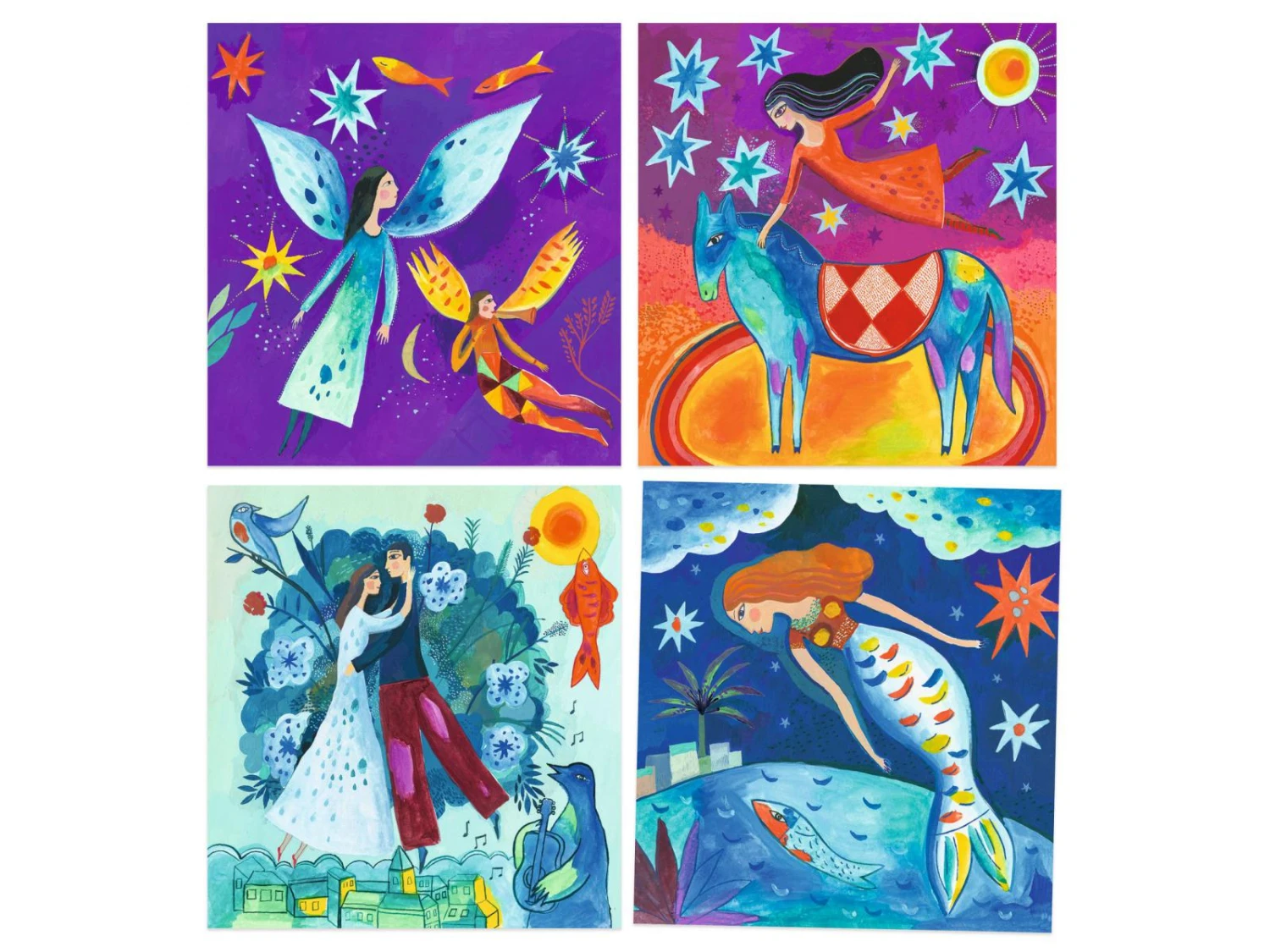 Une activité de peinture aux illustrations inspirées du style du grand maître surréaliste, Marc Chagall. L’enfant ajoute les couleurs par touches et les superpose pour révéler les secrets de ces personnages flottants dans les airs.