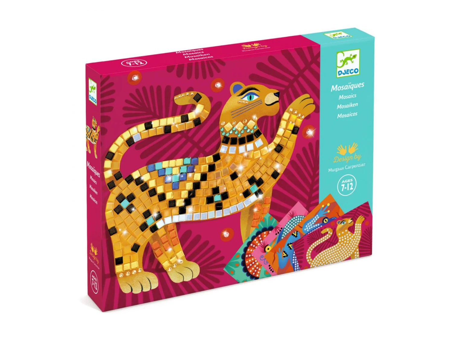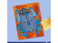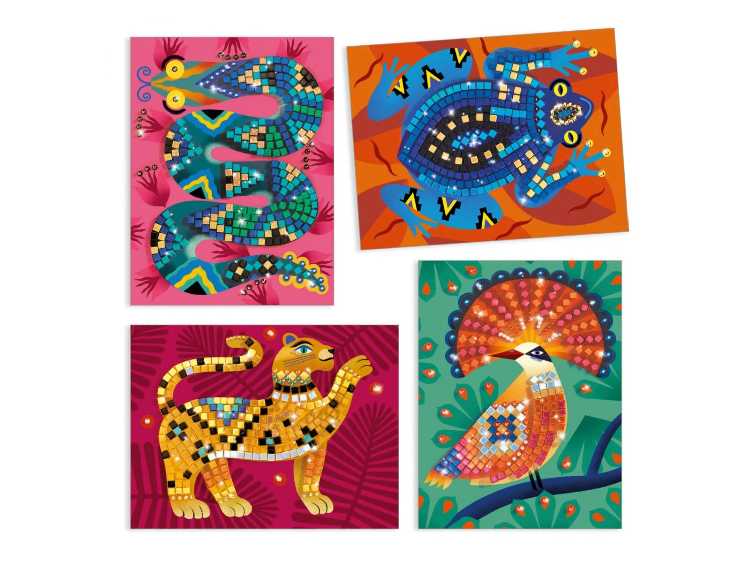 Plongez au cœur de la jungle avec ce coffret d’initiation à l’art de la mosaïque. 4 tableaux à compléter avec de petits carrés de mousse métallisée et des strass qui s’utilisent comme des stickers. L’enfant repère les numéros, puis colle les pièces correspondantes à l’emplacement désigné sur la planche. Les tableaux se remplissent, et la jungle se pare de rayons chatoyants.