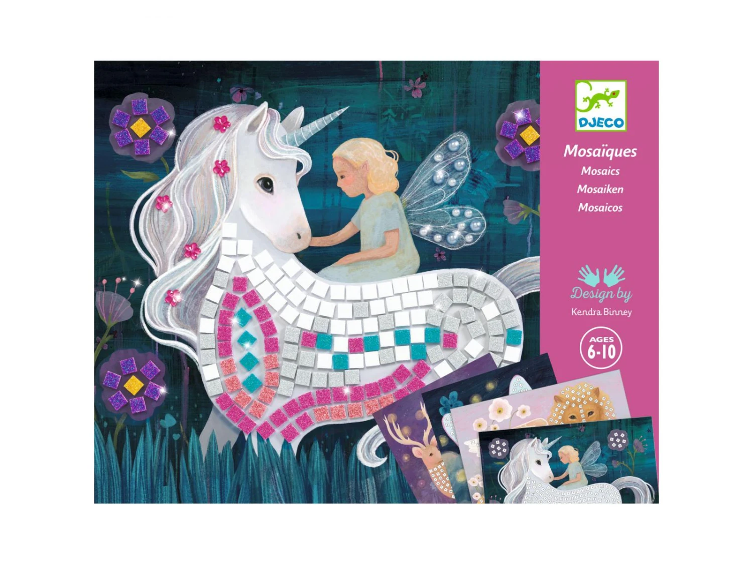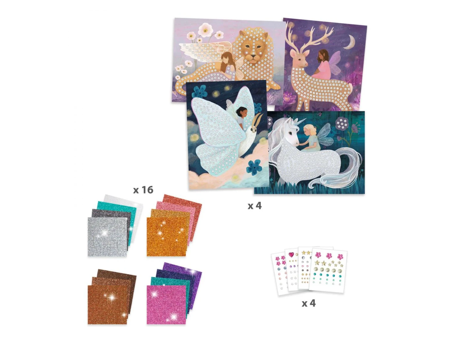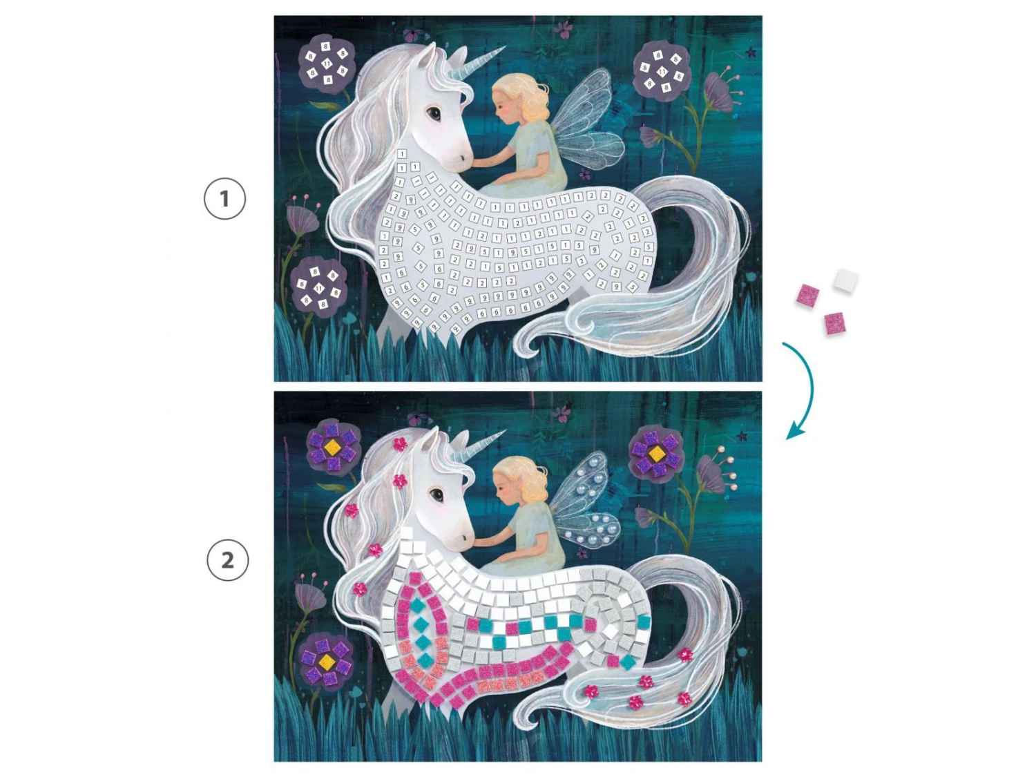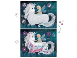 Un coffret pour s’initier à l’art de la mosaïque. 4 tableaux à décorer en collant des petits carrés de mousse pailletée et des strass. L’enfant repère les numéros, puis colle les pièces correspondantes à l’emplacement désigné. Les tableaux se remplissent et le monde enchanté se pare de rayons chatoyants.