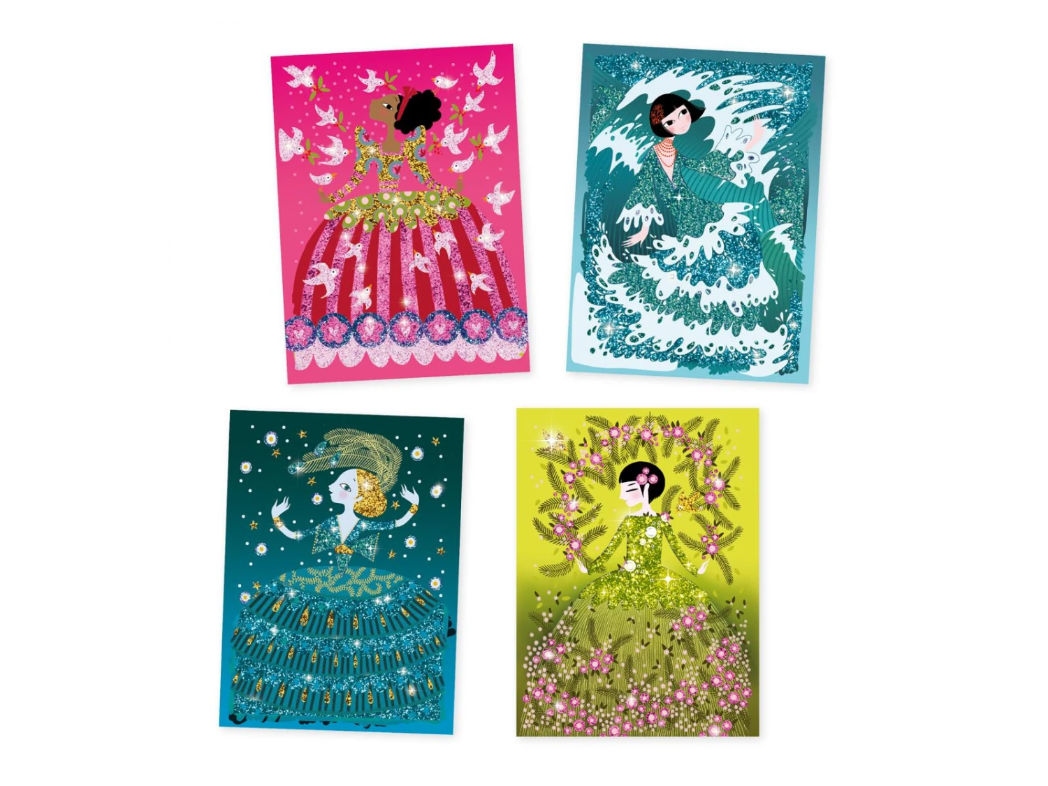 4 tableaux présentant de jolies robes à illuminer de paillettes colorées. L’enfant place son tableau dans la boîte, il dévoile les zones préencollées grâce à l’outil fourni, puis les saupoudre de poudre pailletée en suivant le code couleur indiqué dans le livret. Une fois l’activité terminée, les robes étincellent et s’illuminent avec le plus grand raffinement.
