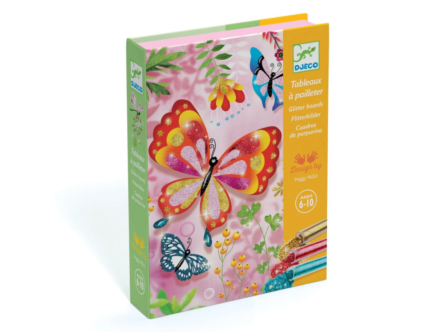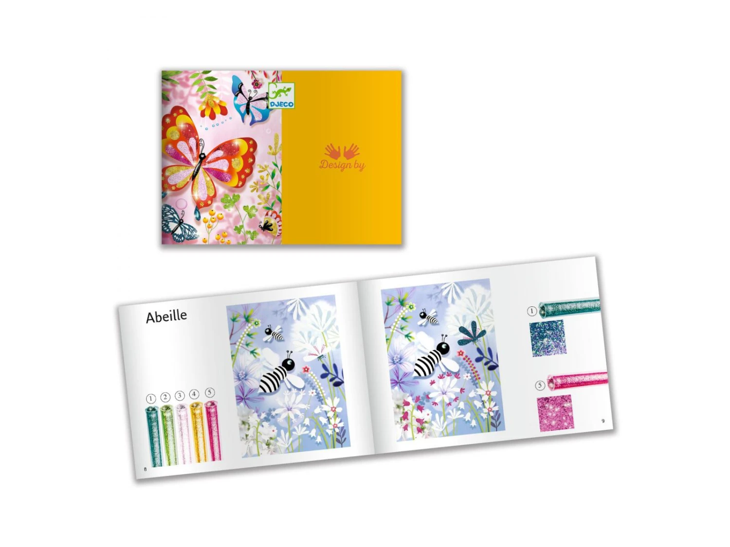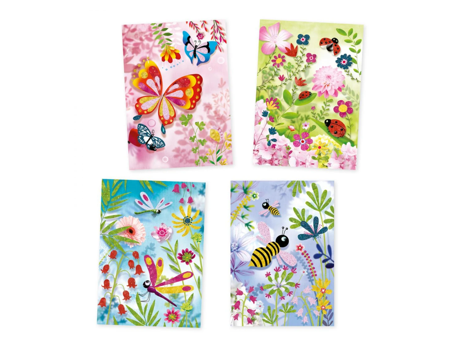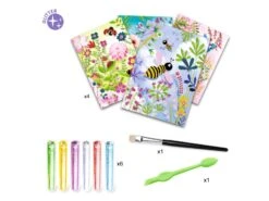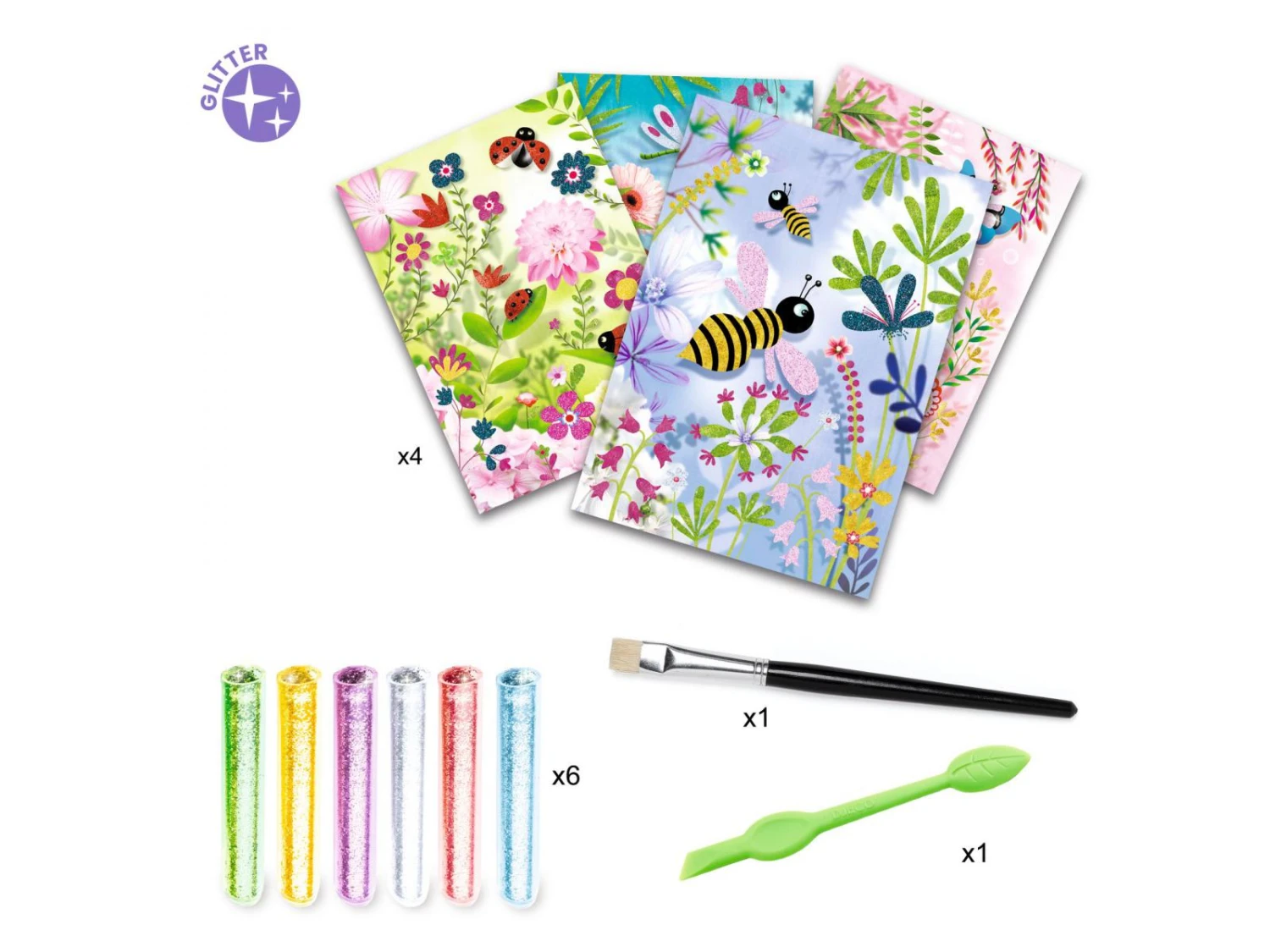 4 tableaux représentant les petites bêtes du jardin à illuminer de paillettes colorées. L’enfant place son tableau dans la boîte, il dévoile les zones préencollées grâce à l’outil fourni, puis les saupoudre de poudre pailletée en suivant le code couleur indiqué dans le livret. Une fois l’activité terminée, les insectes scintillent pour le plus grand plaisir des enfants !