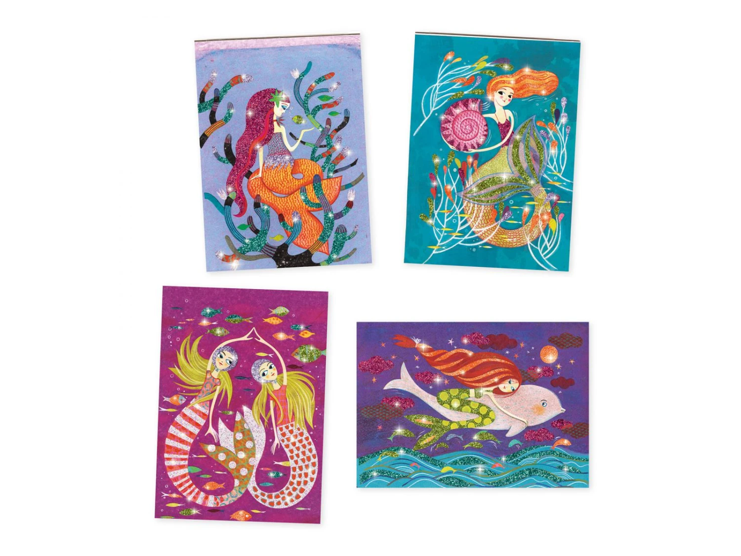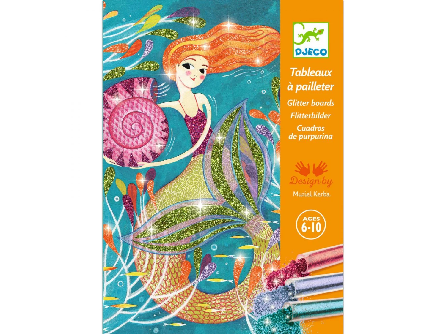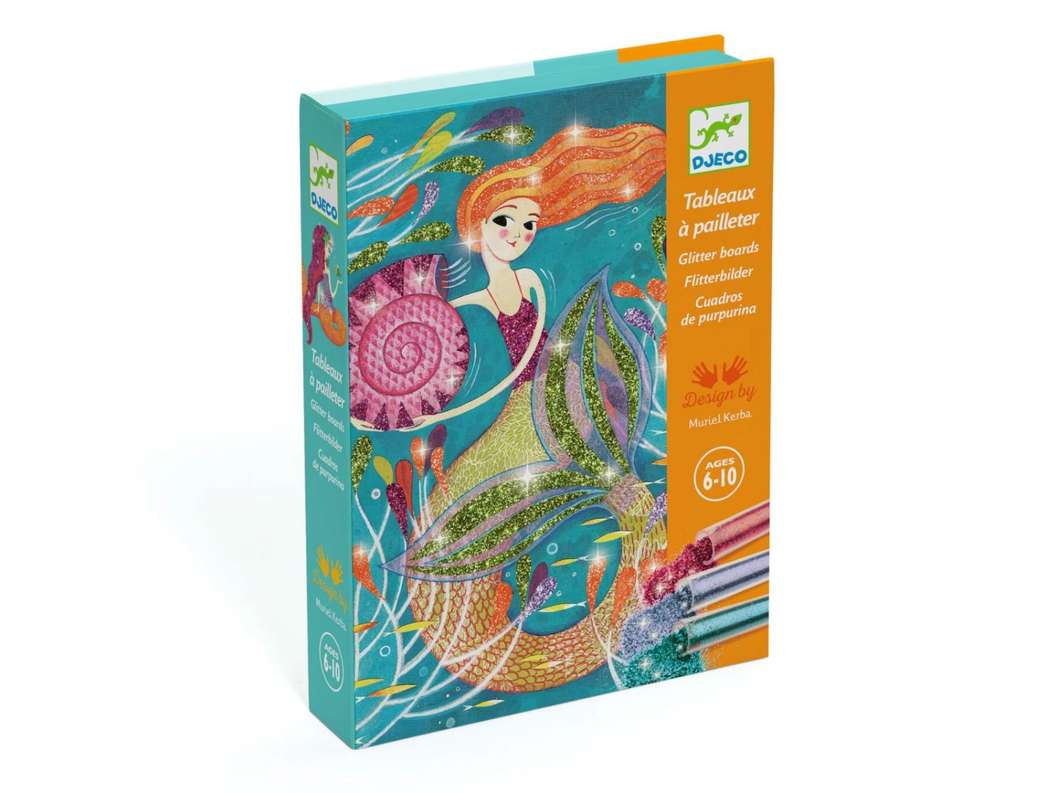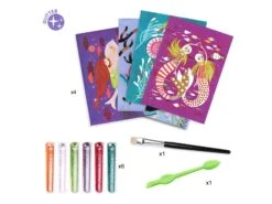 4 tableaux mettant en scène de charmantes sirènes à illuminer de paillettes colorées. L’enfant place son tableau dans la boîte, il dévoile les zones préencollées grâce à l’outil fourni, puis les saupoudre de poudre pailletée en suivant le code couleur indiqué dans le livret. Une fois l’activité terminée, ces merveilleuses sirènes scintillent et enchantent les enfants !