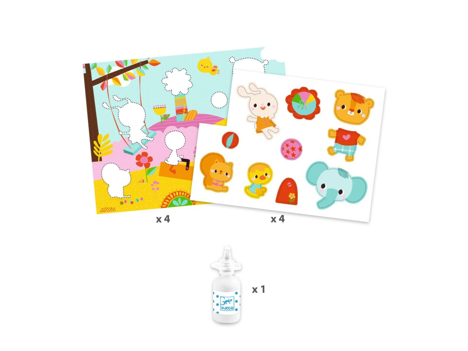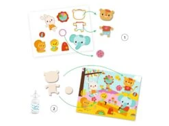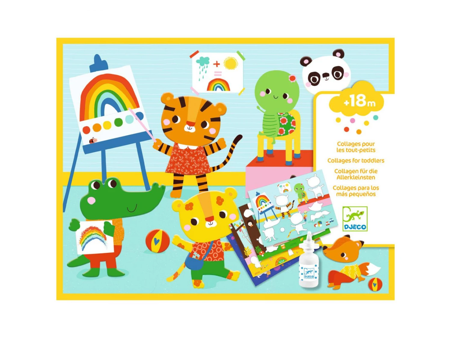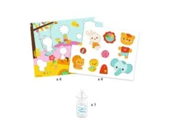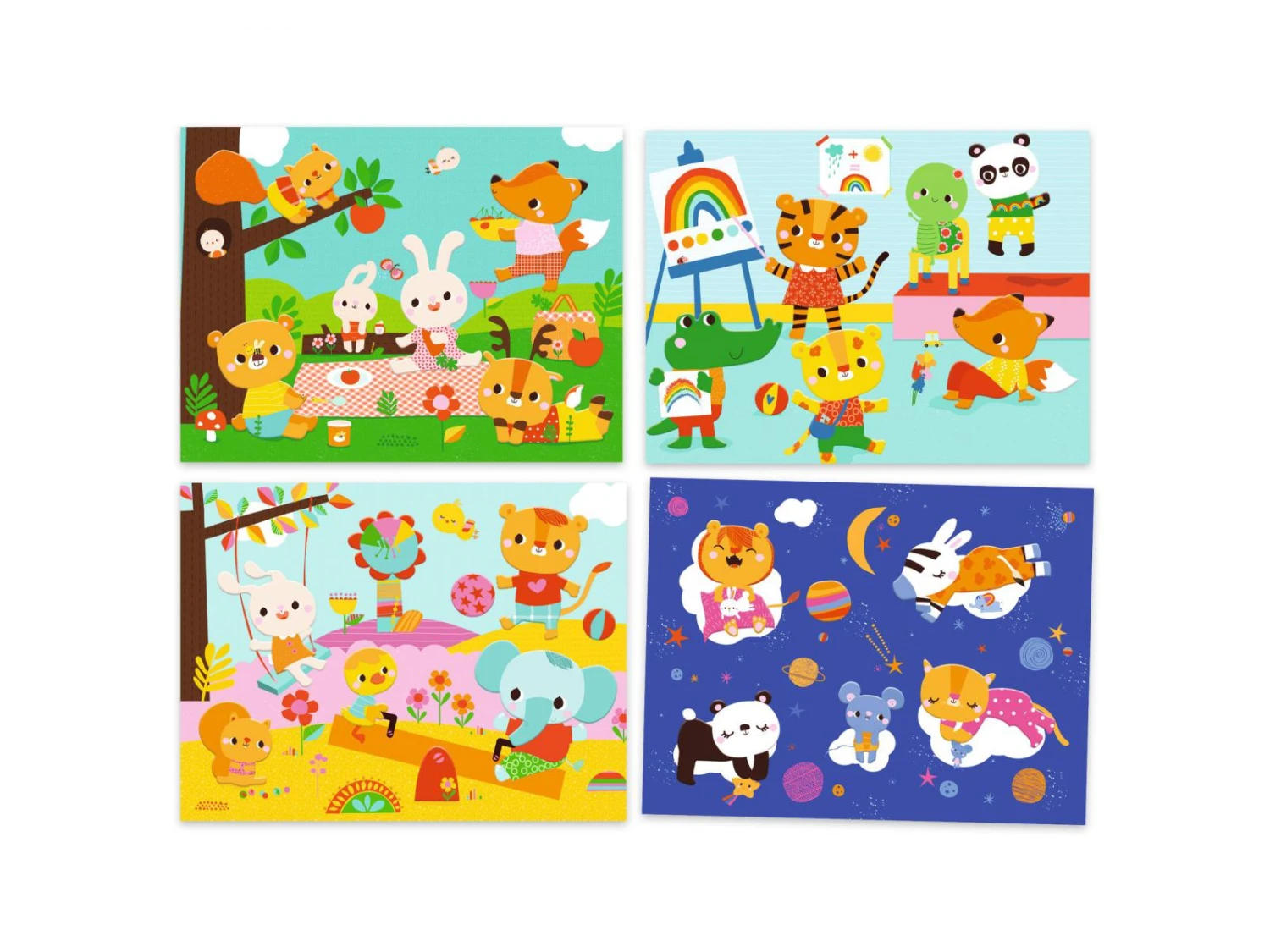 Une première activité de collage pour les tout-petits, dès 18 mois. Des formes épaisses faciles à détacher, à coller sur les jolies illustrations, pour réaliser 4 tableaux.