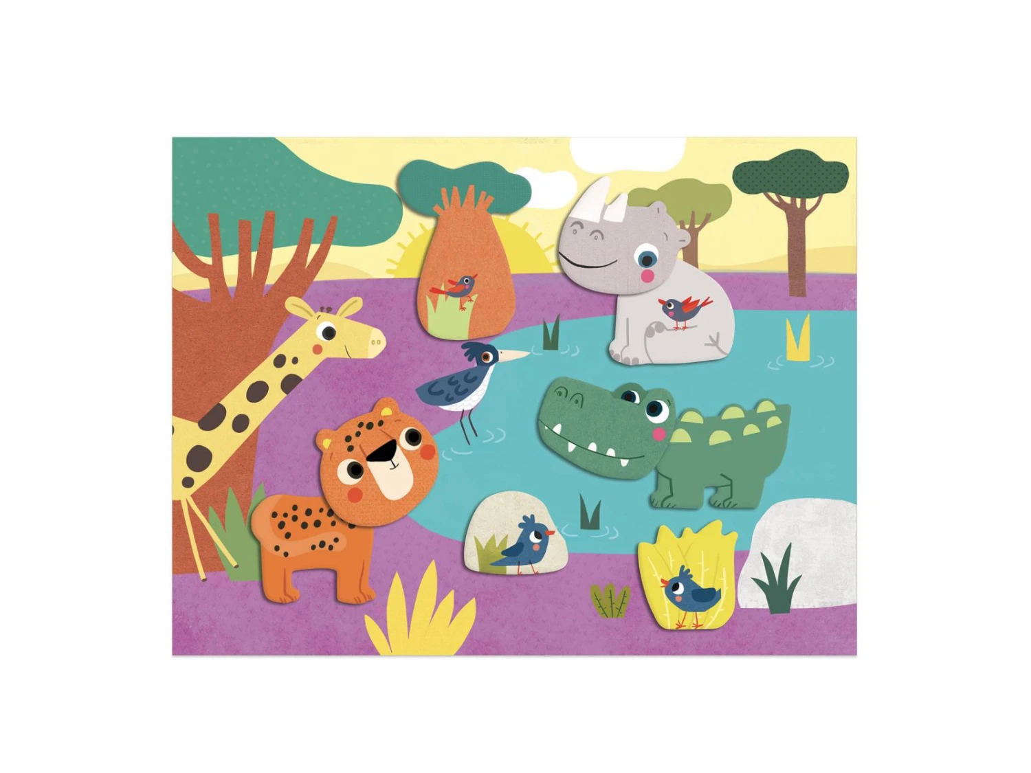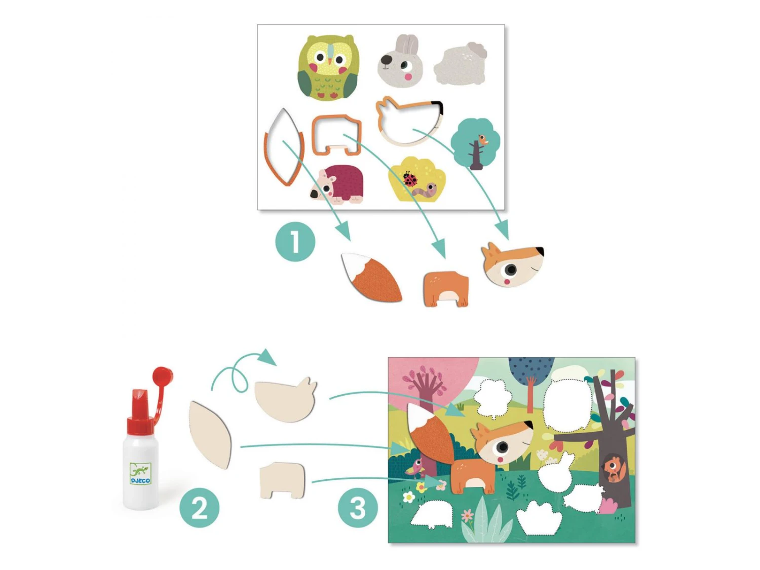 Une première activité de collage pour les tout-petits, dès 18 mois. Des formes épaisses faciles à détacher, à coller sur les jolies illustrations, pour réaliser 4 tableaux.