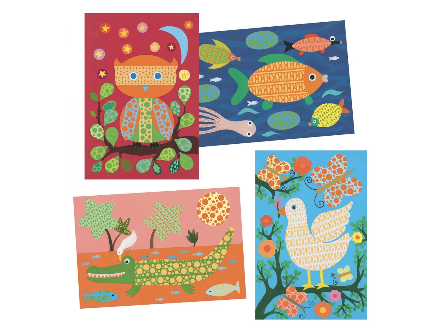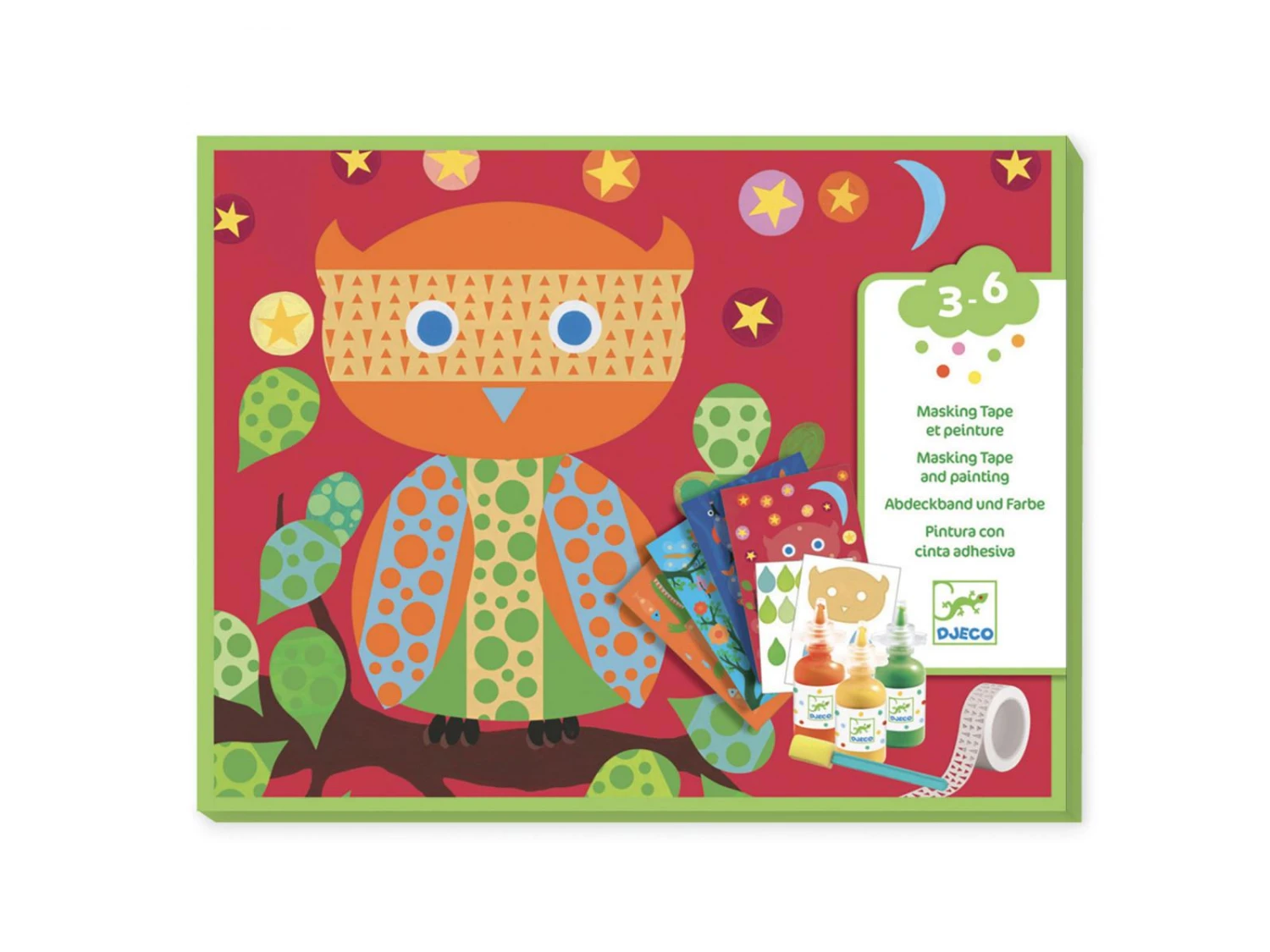 Un grand coffret de peinture sur le thème des animaux. Après avoir protĂ©gĂ© la table avec la nappe, l’enfant colle le masking-tape dentelĂ© sur les grandes cartes illustrĂ©es puis peint par dessus. Une fois la peinture sèche, il retire le masking-tape et dĂ©couvre de jolis motifs. Magique !