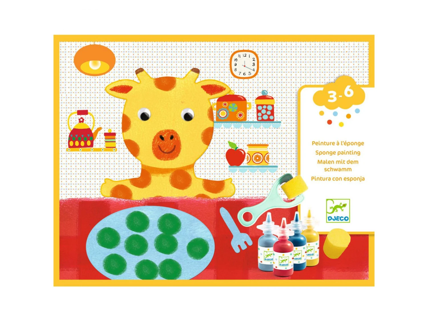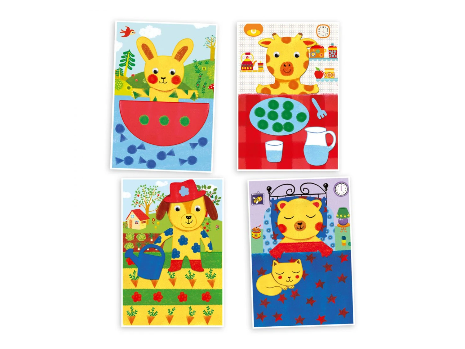 Un grand coffret de peinture sur le thème des animaux. Après avoir protĂ©gĂ© la table avec la nappe, l’enfant peint toutes les pièces en utilisant le pinceau, les rouleaux et les Ă©ponges. Une fois les pièces sèches, il dĂ©core les 4 grandes cartes illustrĂ©es.