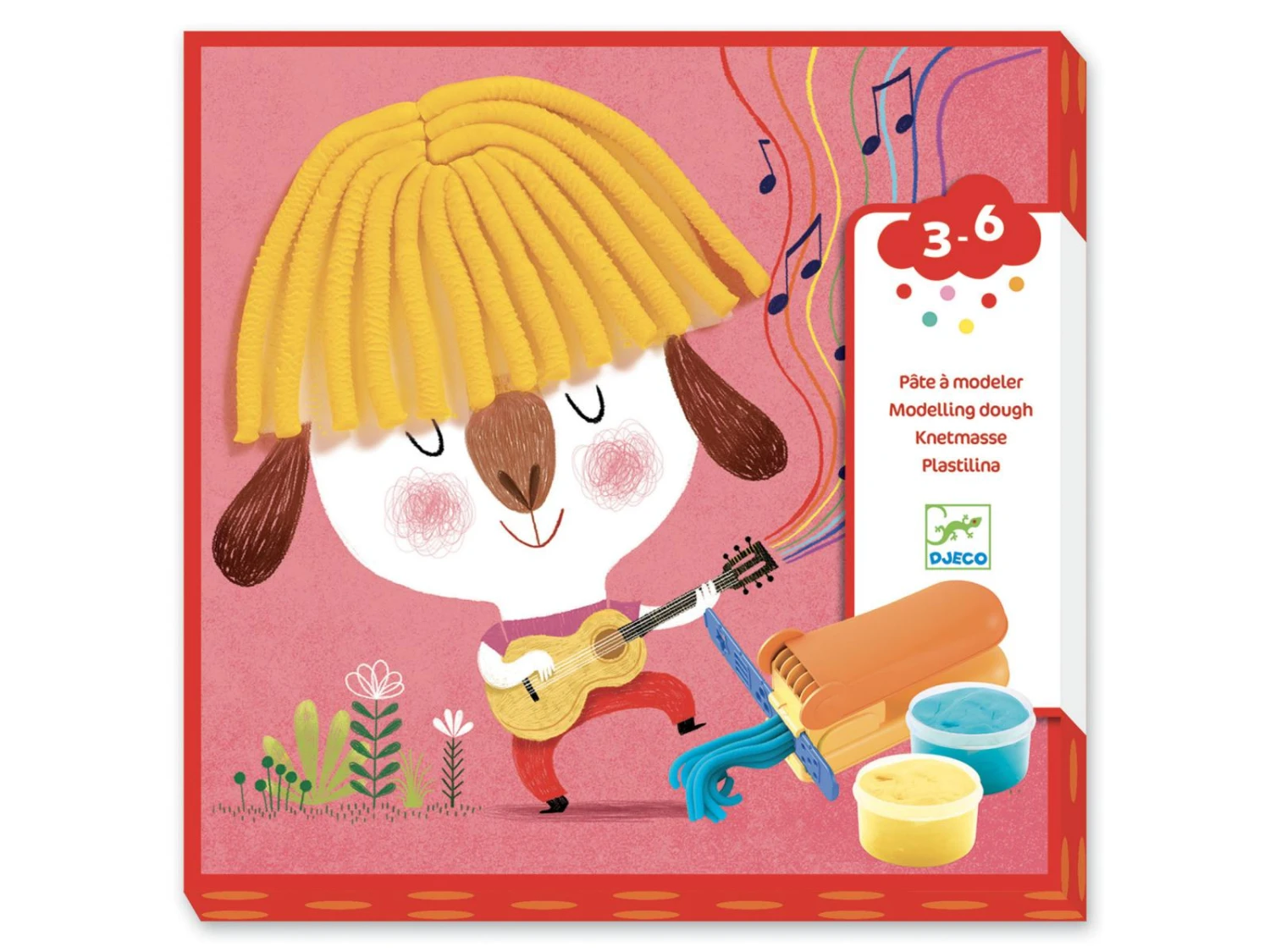 Une machine et 2 barrettes pour faire des cheveux rigolos, une roulette pour les couper. 4 planches illustrées, utilisables à l’infini et bien sûr, 4 pots de pâte à modeler.