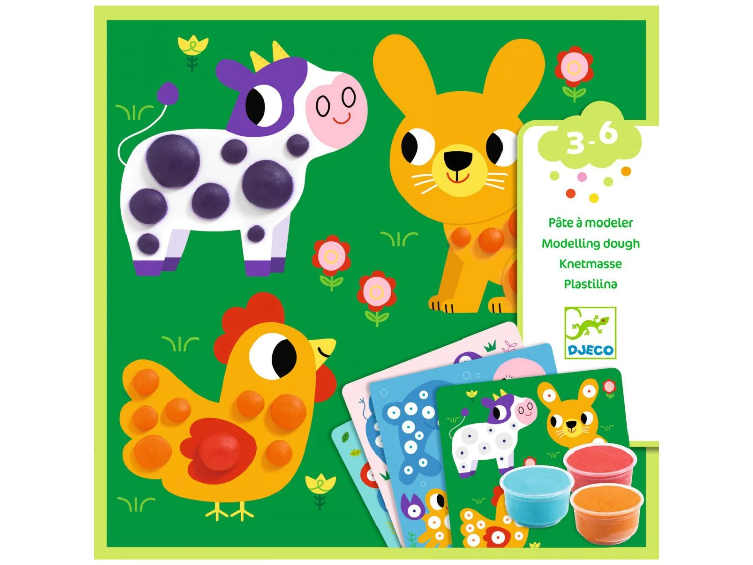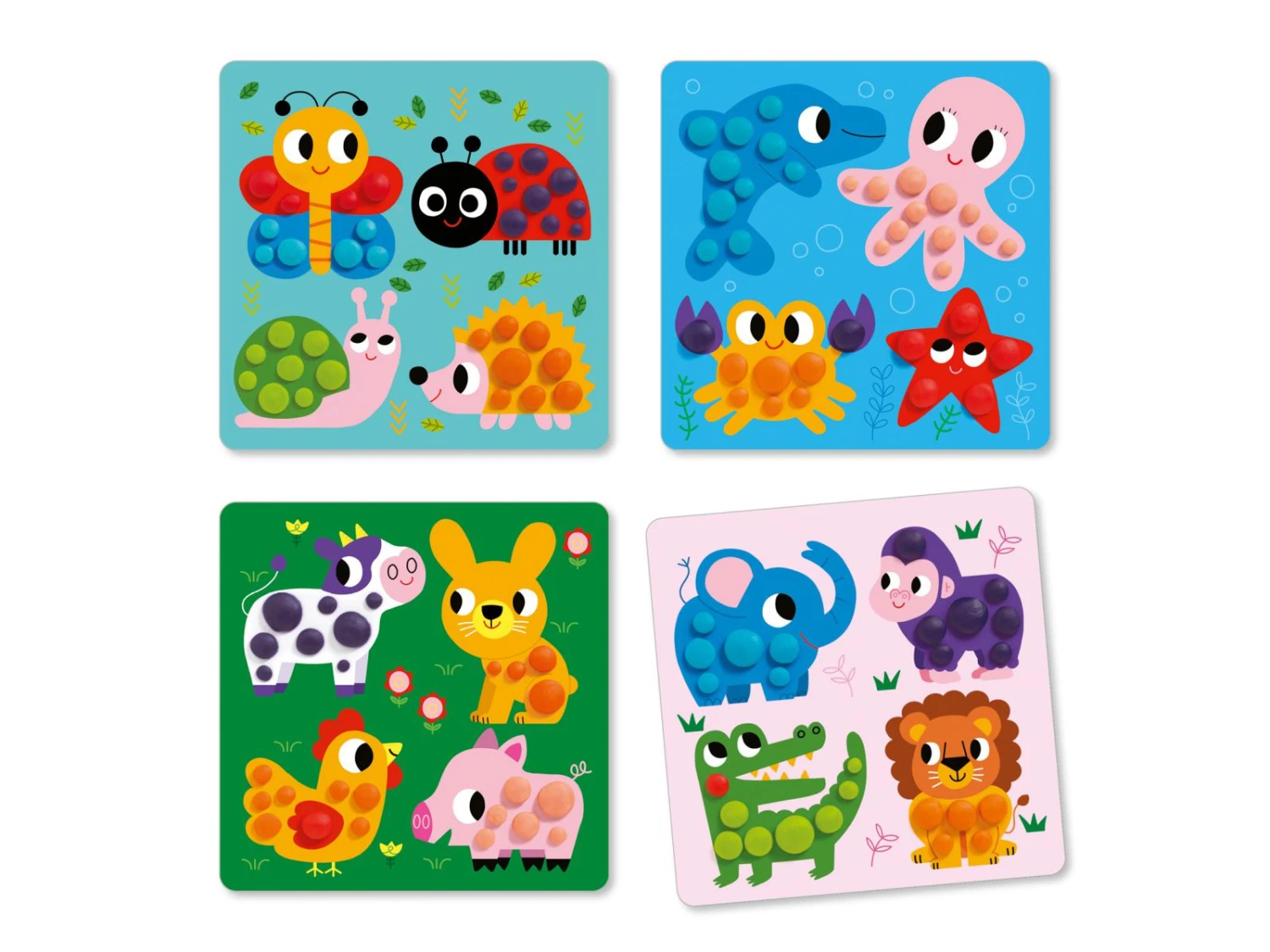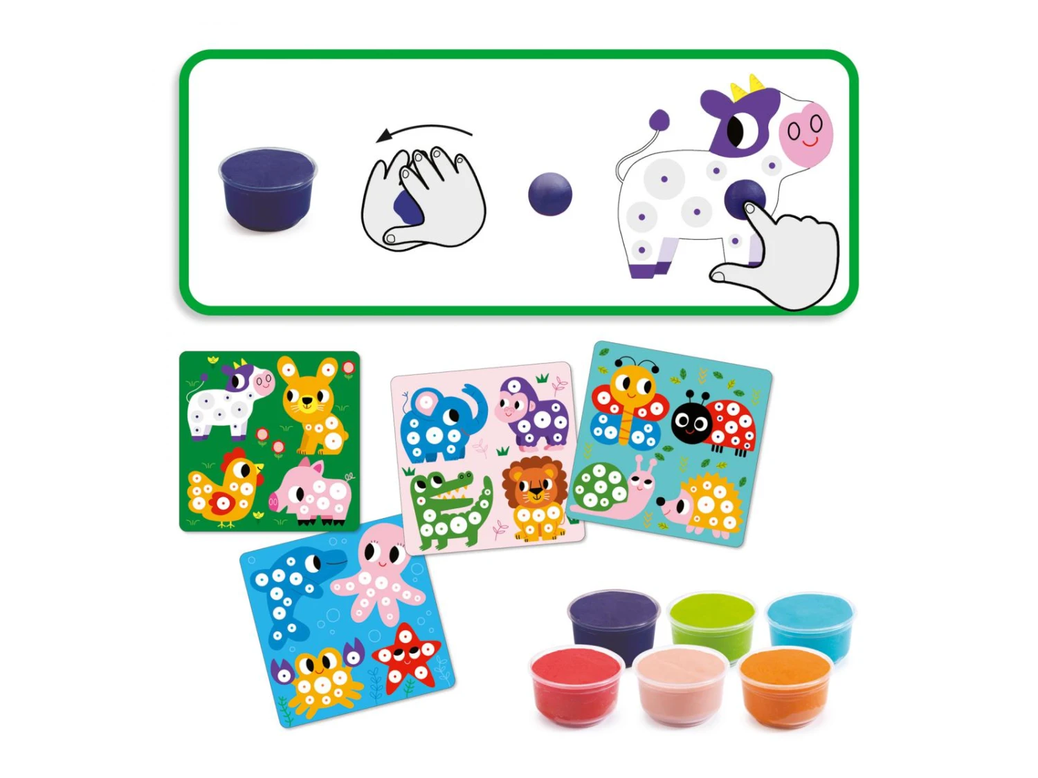 Une activité de modelage originale. L’enfant forme des boules de différentes tailles avec la pâte à modeler et complète les animaux. Il réalise alors de jolis tableaux ! Une fois terminé, il retire la pâte des tableaux et il peut recommencer autant de fois qu’il le souhaite.