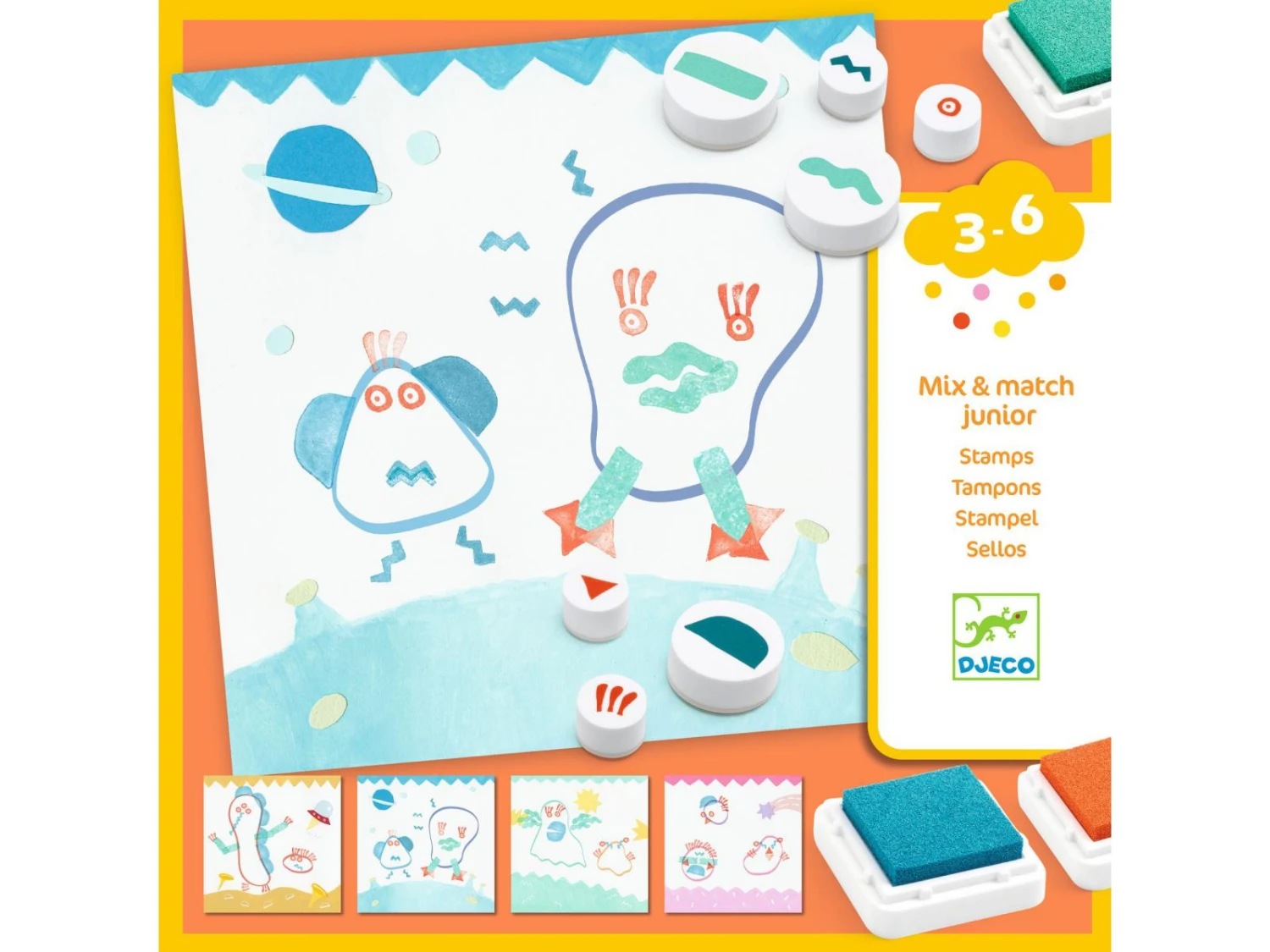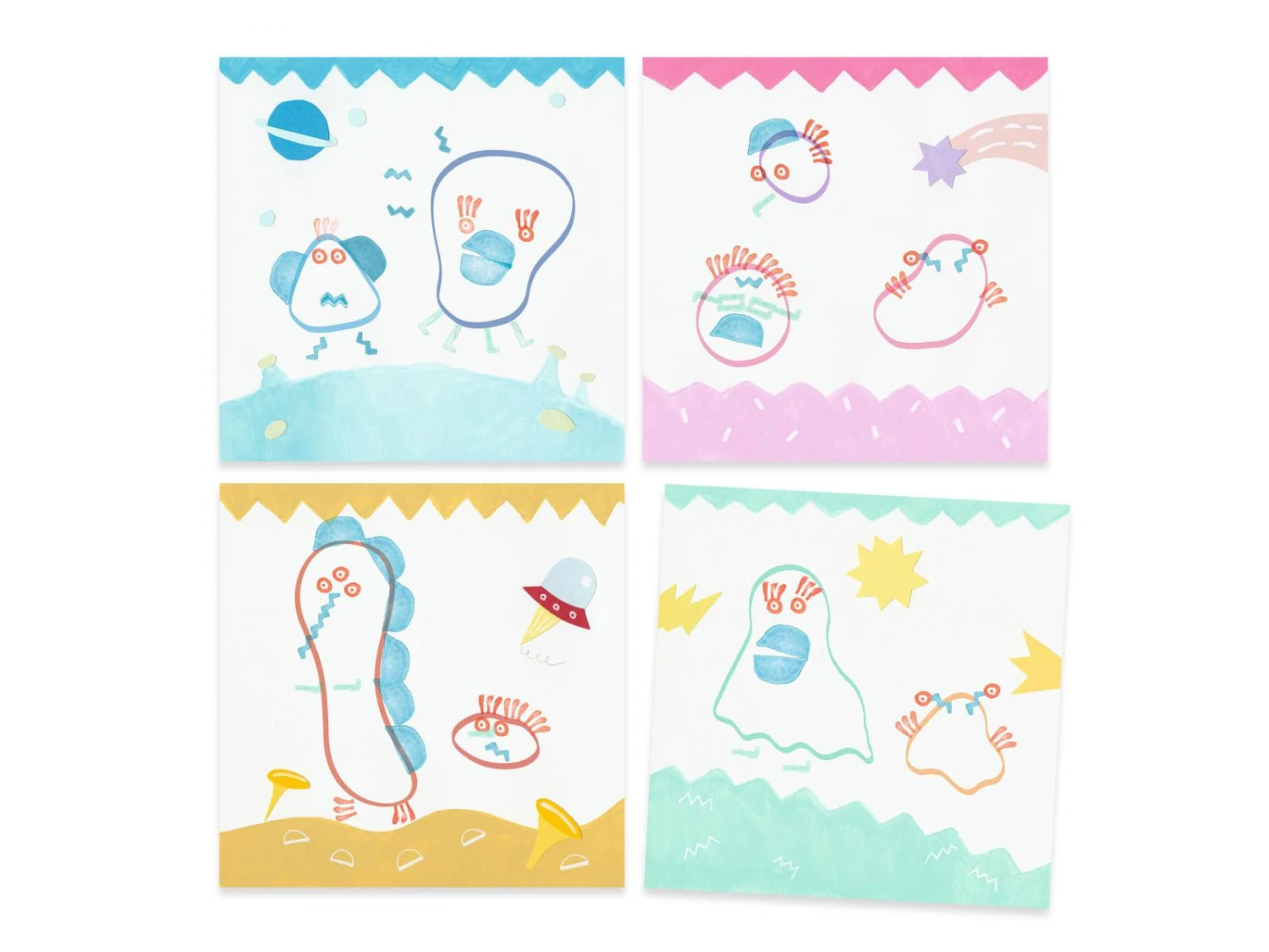 Un coffret de tampons sur le thème des monstres oĂą l’enfant dĂ©core librement les cartes illustrĂ©es.